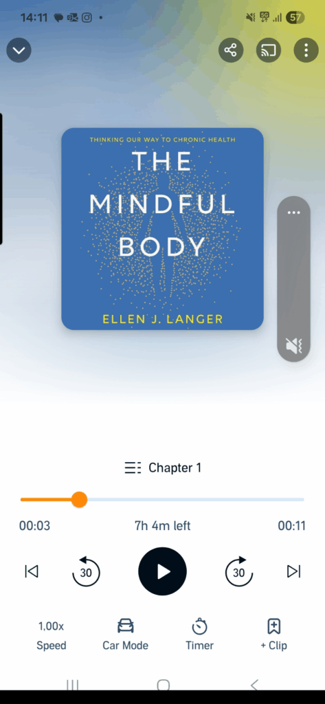 Idag lyssnade jag färdigt på boken: ”The Mindful Body” av psykologen Ellen Langer. Den var väldigt intressant och handlade om kopplingen mellan kroppen och sinnet och hur allt hänger ihop. Kroppen är inte separat utan hela tiden i samspel med sinnet. Nu ska jag lyssna på en annan bok av henne som heter just ”Mindfulness”. Det ska bli väldigt intressant!